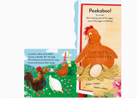 How does a chick start life as an egg and transform into a fully grown chicken? Turn the pages of this beautiful book and find out! Babies and toddlers will love lifting big flaps to find five peekaboo surprises popping up from the pages: an egg wobbling in its nest, a tiny chick hatching from an egg, a fluffy chick growing into a feathery chicken and showing off its wings, a hen venturing outside to feed, and a mother hen with her brood of chirpy chicks hatching from their eggs - and so the cycle begins again!