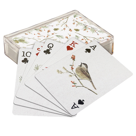 A 54-card playing deck from our Christmas Collection displaying charming designs of winter birds on each card as well as a pattern of winter greenery on the backs. Winter designs are replicated from original art hand painted in a unique watercolor style. Our Winter Birds playing cards are packaged in a protective acrylic case for easy storage when not in use or traveling. A nature-themed Christmas gift perfect for on the go games.